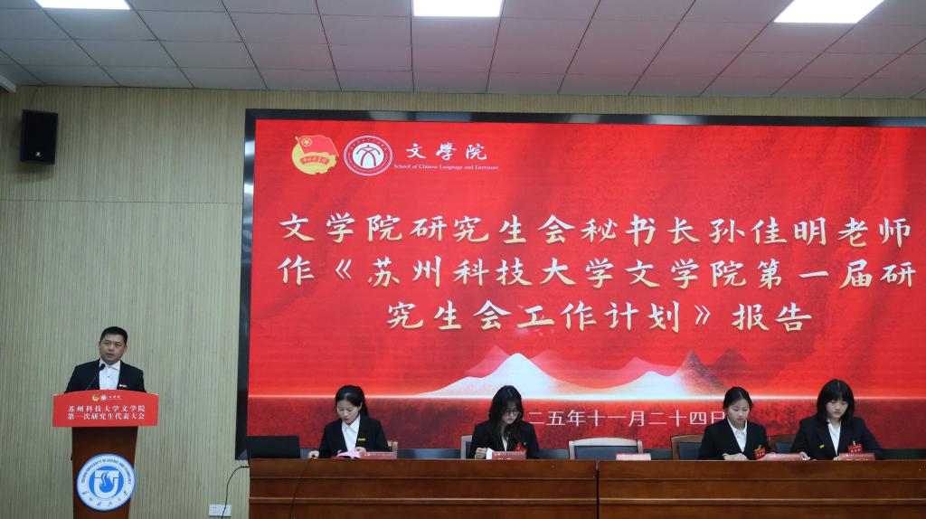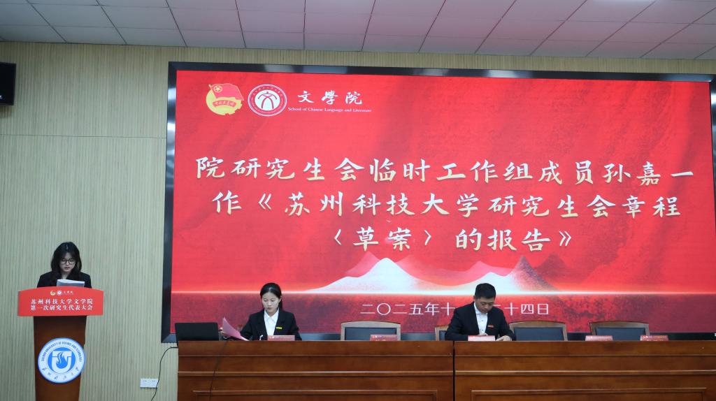 会议审议通过了《苏州科技大学文学院第一届研究生会工作计划》《苏州科技大学文学院研究生会章程(草案)》等重要文件。