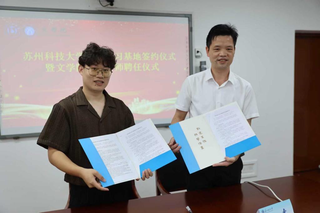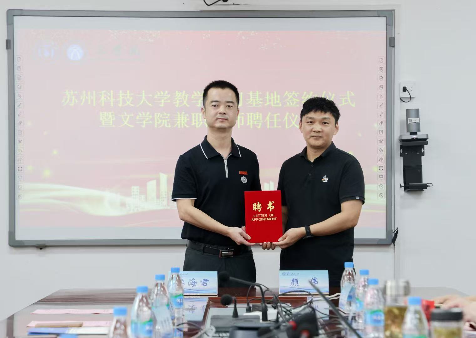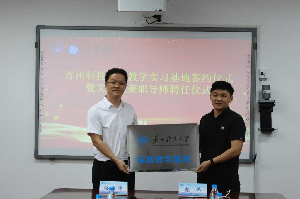 孙虎与吴建海签订文学院实践教学基地协议、路海洋为实践教学基地授牌、学院党委书记季海君授予颜伟校外导师聘书,标志着校企双方的合作迈出了关键一步。