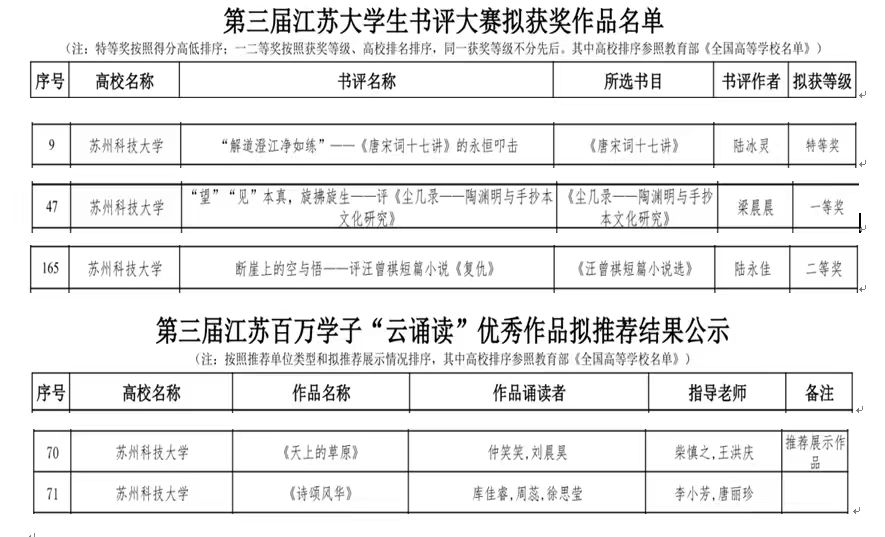 近日,第三届江苏大学生读书文化节相关推荐活动评选结果公示。活动由省教育厅主办、省高等教育学会协办。本届活动继续采用限额推荐参赛方式,我校共推荐5个作品参加大学生书评大赛,最终文学院的3个作品荣获特等奖1项(全省仅12项)、一等奖1项、二等奖1项;推荐2个作品参加百万学子云诵读活动,全都获评优秀作品(获奖作品不分等次),其中《天上的草原》入选“推荐展示作品”(全省推荐展示作品40件),将在江苏大学生经典诵读“云展厅”公开展示和宣传推广。