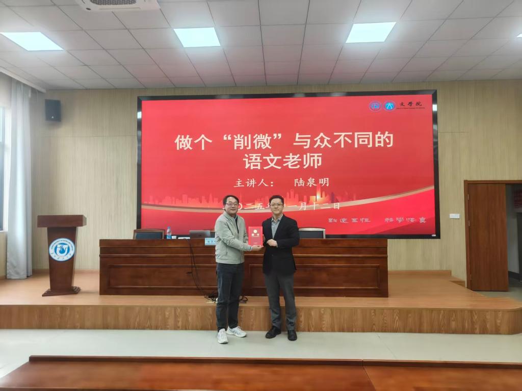陆泉明以《做个“削微”与众不同的语文老师》为题,鼓励学生要做语文“大先生”,要从如何做一个学生喜欢的老师、做一个家长喜欢的老师和做一个自己喜欢的老师做起。强调师范生加强阅读,提升文本解读能力,提升个人素养,更好地适应与学生“共阅读”和“共写作”。活动结束后,唐柏鉴校长与陆书进行了亲切交谈。