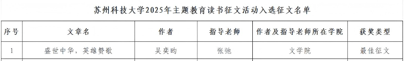 近日,江苏省教育系统关工委发布《关于公布2025年主题教育读书征文活动入选征文名单的通知》(苏教关委〔2025〕12号),我院汉师2312班学生吴奕昀作品《盛世中华,英雄赞歌》(指导教师:张弛)荣获最佳征文。
