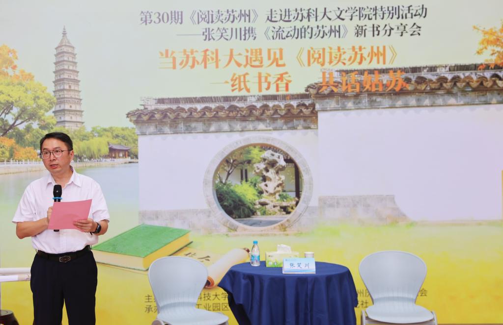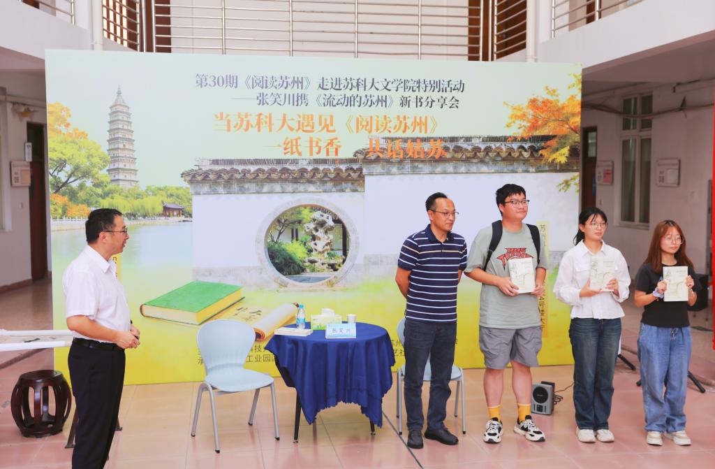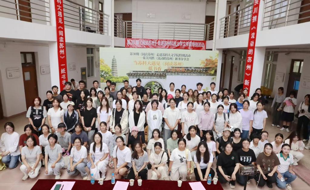 近日,为加强2025级新生学风建设,增进新生对苏州的了解,文学院于天平校区举办了第30期《阅读苏州》走进苏科大文学院特别活动——张笑川携《流动的苏州》分享会以及2025级新生学风建设系列活动启动仪式。分享会由丁香文艺社徐书僮主持,苏州历史文化研究会会长李峰、文学院党委副书记瞿晓庆、文学院副教授张笑川、文学院辅导员李洋等人出席,文学院全体新生共同参加。