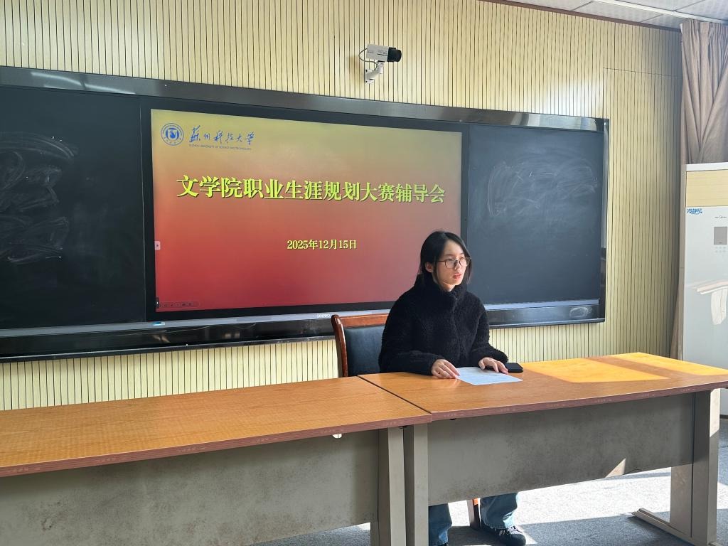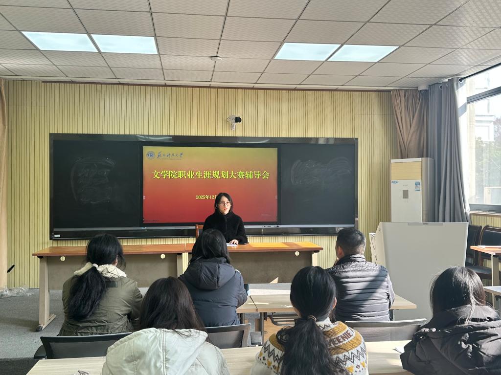 12月15日下午,文学院职业生涯规划大赛辅导会在教五103举行。校职业生涯规划大赛获奖者、23级汉师专业陈锦同学分享备赛经验,活动由文学院学工办主任孙佳明主持。