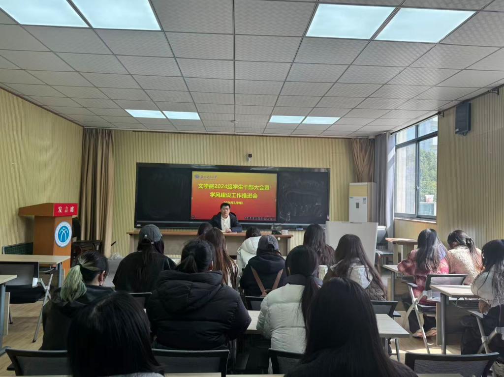 为进一步强化学生骨干责任意识,扎实推进学风工作建设与校园安全管理,文学院于3月9日召开2024级学生骨干大会暨学风建设工作推进会。会议由24级辅导员孙佳明主持,24级全体学生干部参加会议。